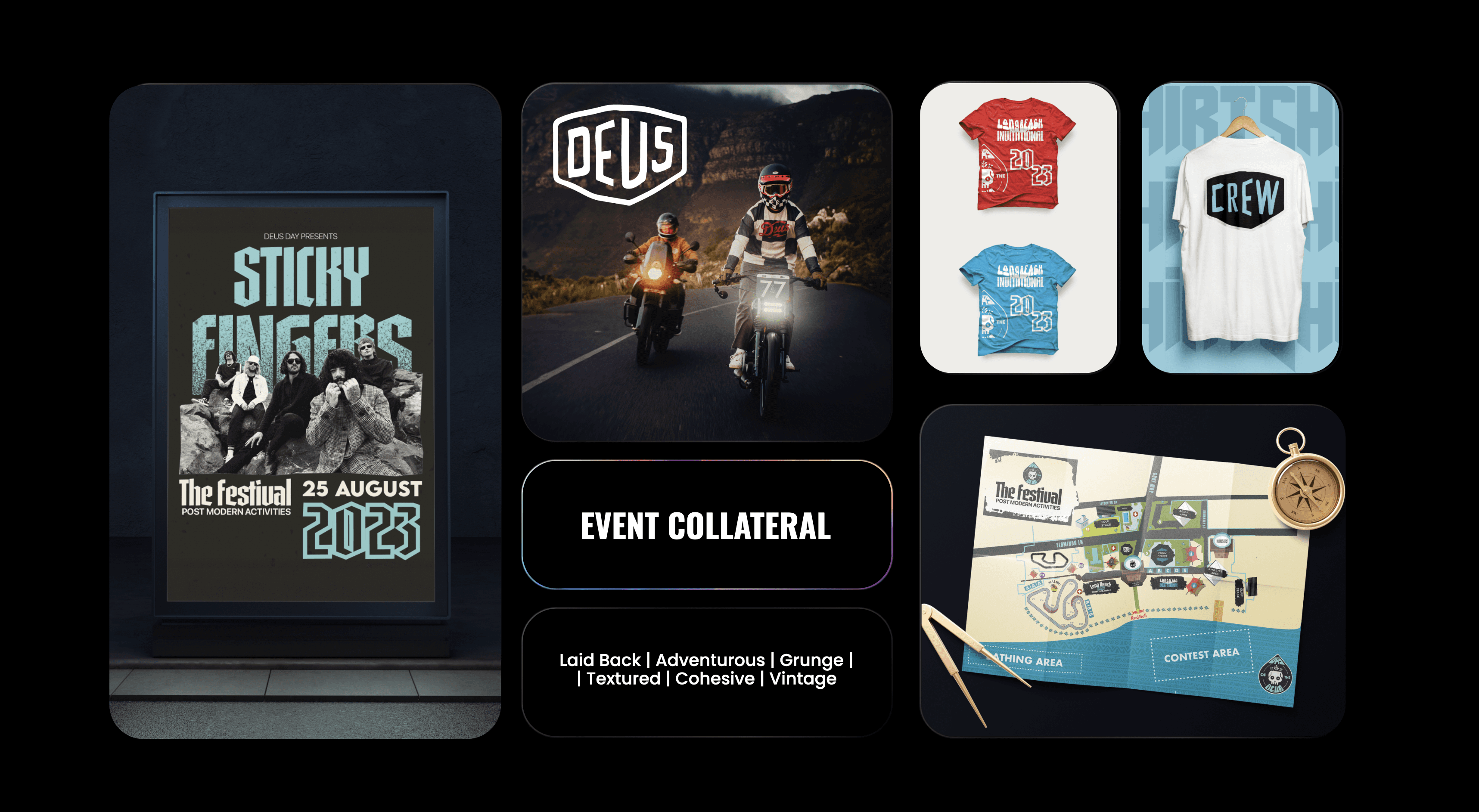 Design a full campaign including logo, event collateral and all marketing assets for a festival held in Kommetjie 2023 centred around the sub cultures of Motorcycles, surfing and music.